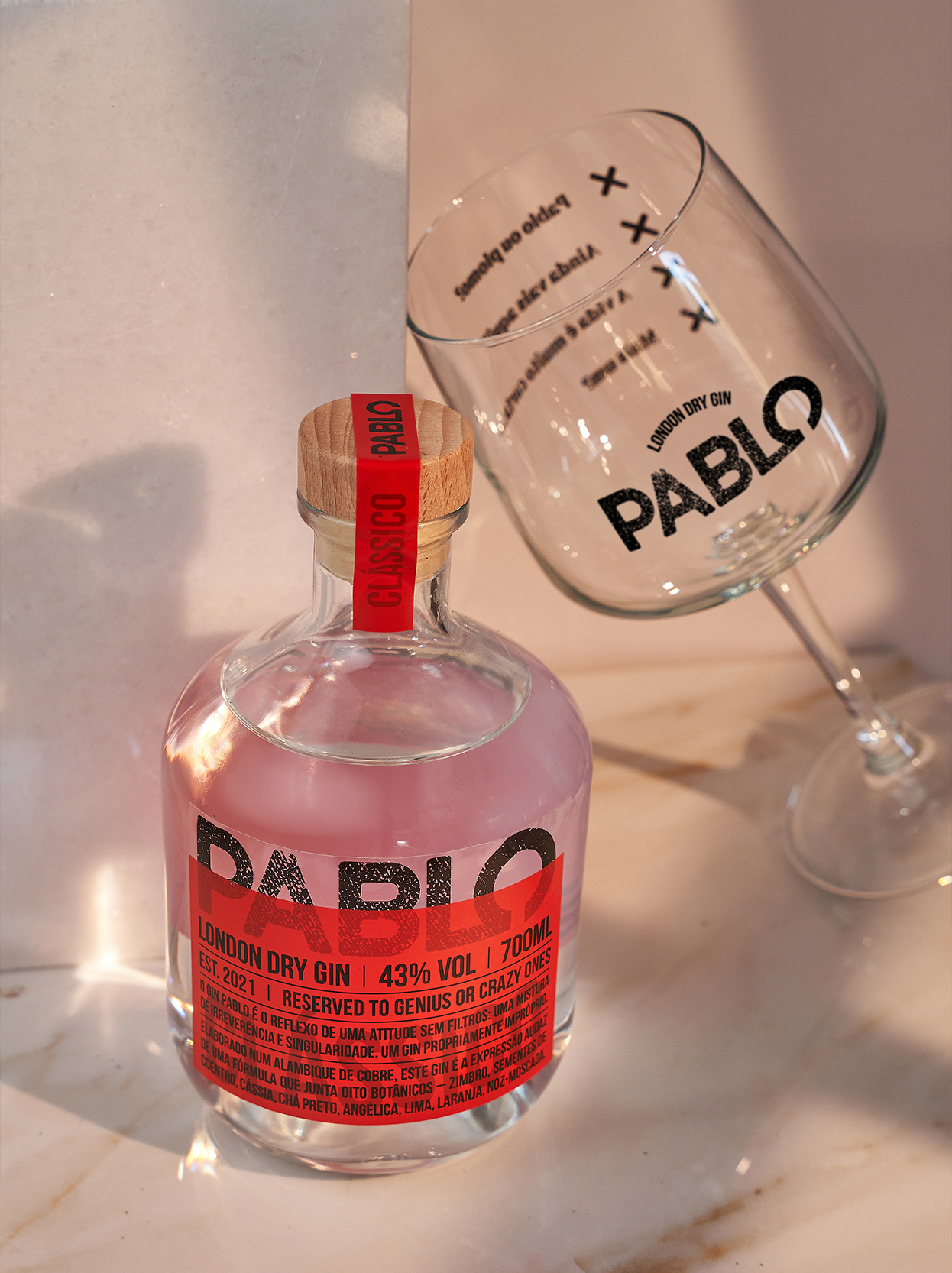 O pack inclui uma garrafa de Gin Pablo Clássico e 1 copo de Gin Pablo